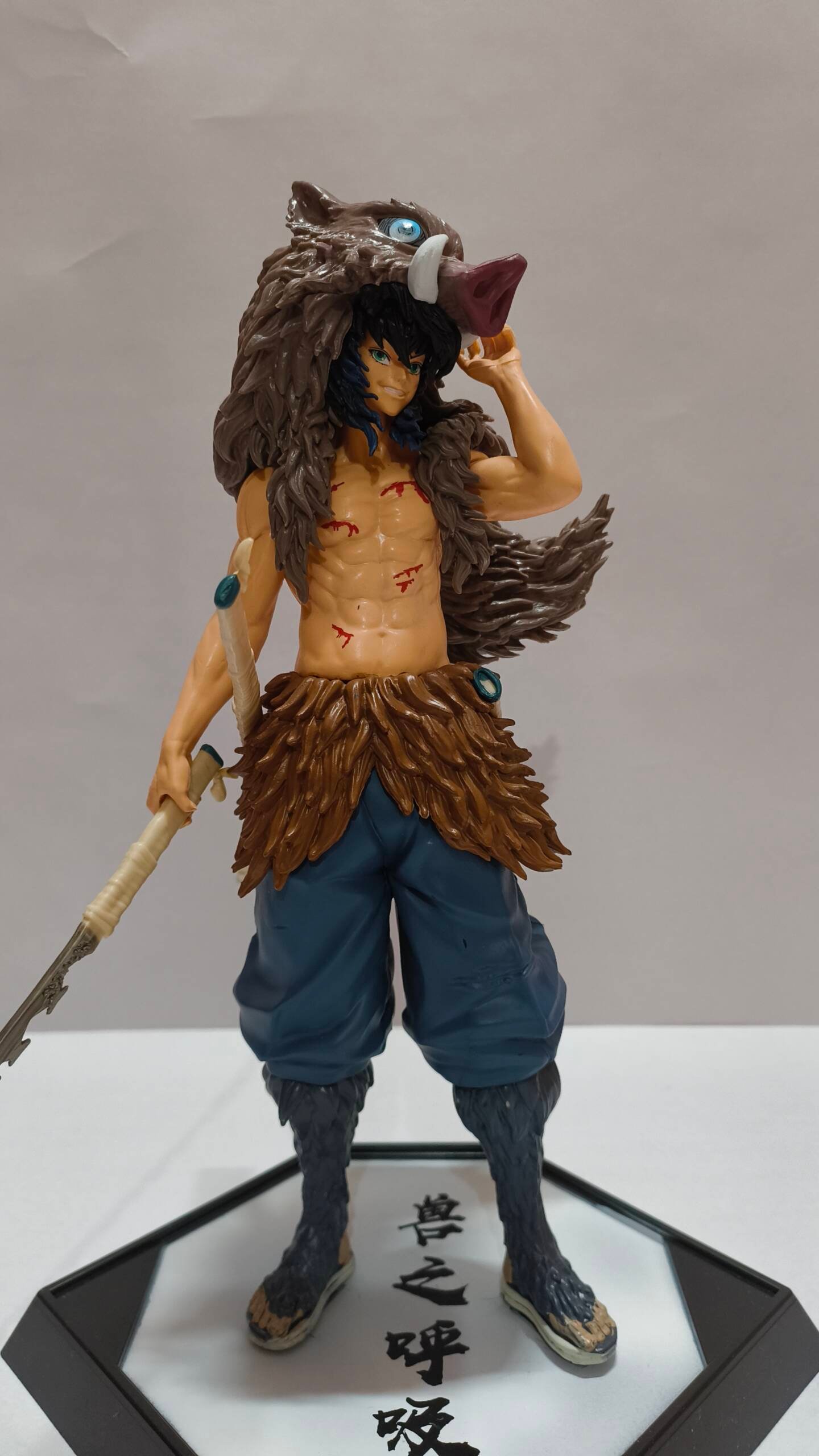 This Inosuke Hashibira figure from Demon Slayer: Kimetsu no Yaiba captures the raw, battle-hardened energy of the Beast Breathing swordsman. Standing tall in a commanding pose, Inosuke rests one serrated Nichirin blade at his side while gripping his iconic boar mask—revealing the fierce yet striking face beneath.